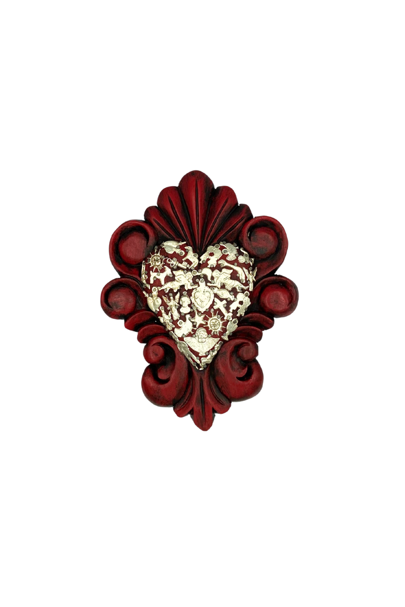 Red Mexican Hand Carved Wooden Heart with Milagros